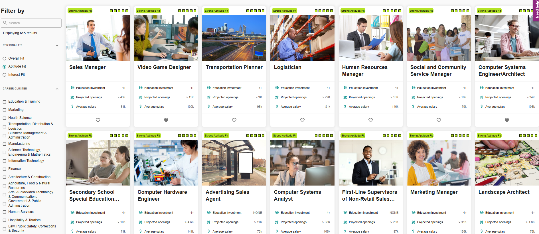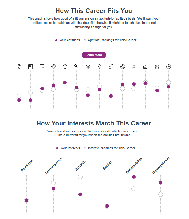 Test sonunda 40 sayfalık bir rapor elde eder ve kişinin güçlü ve zayıf yönlerini görebilirsiniz. Ayrıca, portalda 615 meslek arasından sizin yetenek ve ilgilerinize en uygun meslekleri aşağıdaki resimdeki gibi sıralar.
